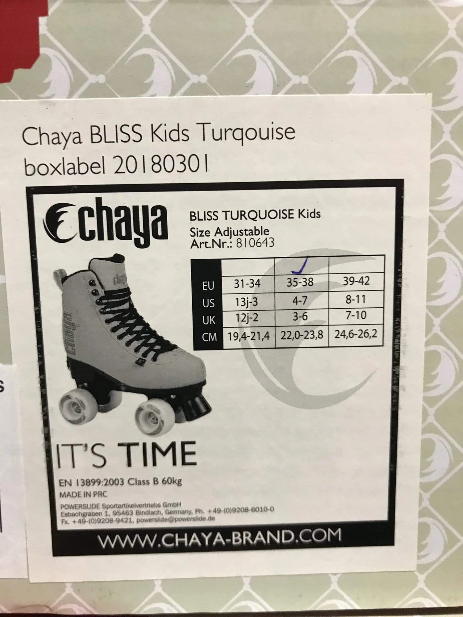 The Chaya Bliss Turquoise roller skate is the latest innovative creation. It´s the first of its kind featuring a brand-new construction. Changing the size just takes a few seconds by simply turning the lever placed on the rear of the skate. The boot always keeps its original form as just the toe cap inside the boot moves back and forth to allowing you to adjust the size. The skate impresses with great quality, comfort and nice support.