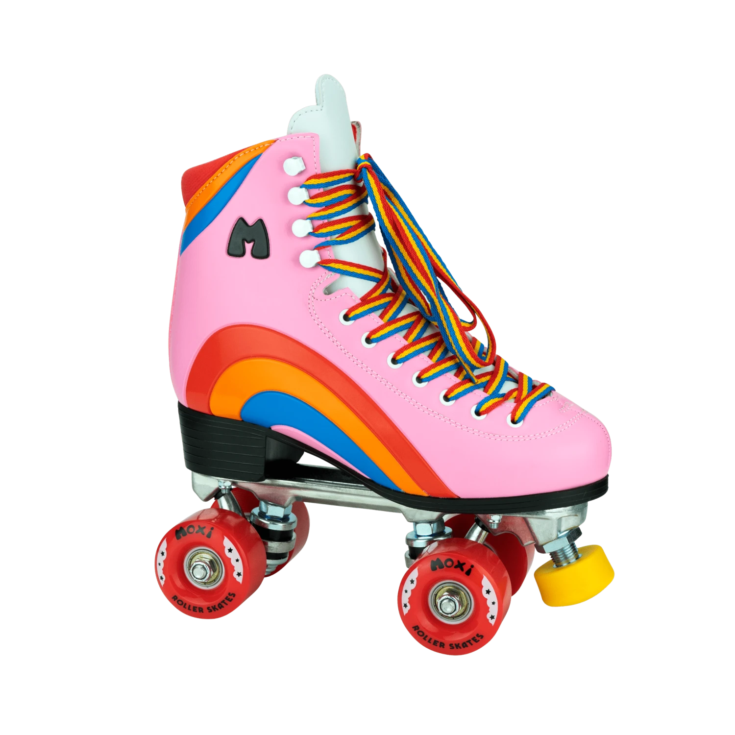 The Moxi Rainbow Rider is designed for the beginning recreational skater looking for an outdoor roller skate packed with high-quality comfort at an affordable price. The Rainbow Rider features a reliable boot made of vinyl uppers and a padded, soft lining that is comfortable to the skin for a supportive and care-free stride. Rainbow-themed graphics and a no-maintenance PVC outsole round out the boot, which is attached to a durable die-cast aluminum plate, soft outdoor wheels, ABEC-5 bearings, and an adjustable toe stop to ensure a smooth, cruiser-friendly ride. Brimming with attention to detail and thoughtful touches, the Rainbow Rider is an undeniable value for the beginning or casual outdoor skater. It will leave you feeling like you are gliding along rainbows!