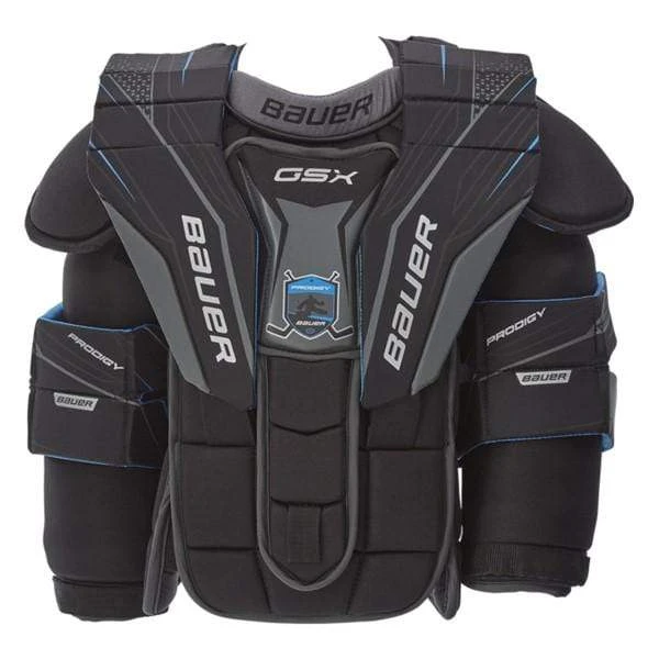 An overall flexible design caters to young goalies. The shape of the chest and arm has been upgraded to create more adjustability and a better fit. Extra arm and shoulder padding absorb impacts.