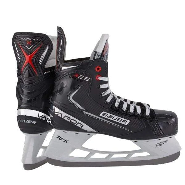 The Vapor X3.5 fit is enhanced through a one-piece 3D Poly carbon quarter package and a TPR outsole. The quarter package provides a solid fit in the ankle and heel while the outsole gives the skate more flexibility for ease-of-use; an important feature for the new hockey player who might not yet need a very stiff boot for performance. Inside the boot, Bauer includes memory foam padding around the ankles for increased support. This material gives you the feel you want and keeps you comfortable as you develop your skills on the ice. Bauer also added design elements to our microfiber liner, to further enhance the overall feel and appearance of this skate. The X3.5 also includes a 40oz felt tongue with mesh metatarsal guard for increased protection and comfort at the top of the skate; the Lightspeed Pro II holder to lock in your blade; and the S Stainless steel runner for added durability. If you’re a recreational player or new to the game of hockey, you certainly aren’t restricted to this price point. If you want the top technologies and performance features that Bauer has to offer, resulting in more comfort, a better fit, and improved performance, it is certainly worth it to consider a higher end Vapor model like the 3X Pro. But if you’re looking for an affordable and comfortable skate that offers good features at a great value, the Bauer Vapor X3.5 is a great option.